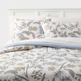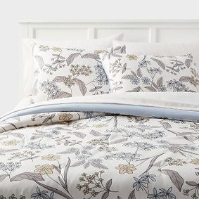 Each lightweight bedding set includes one comforter and two matching pillow shams (twin and twin xl sizes include one sham), all made with hypoallergenic and moisture-wicking microfiber. One side is a chic neutral blue gray, and the other features a light blue gray floral damask pattern with a glam vintage-inspired finish.
