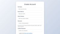 <body> <div class="container"> <div class="form-container"> <h2 class="text-center mb-4">Create Account</h2> <form id="registrationForm" novalidate> <div class="mb-3"> <label for="fullName" class="form-label">Full Name</label> <input type="text" class="form-control" id="fullName" name="fullName" required placeholder="Enter your full name"> <div class="error-message" id="fullNameError"></div> </div> <div class="mb-3"> <label for="email" class="form-label">Email Address</label> <input type="email" class="form-control" id="email" name="email" required placeholder="Enter your email"> <div class="e