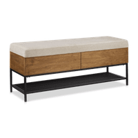 Fabric, Caned Drawers and Metal Storage Bench from Bouclair Item Dimensions Width: 43.25" (110.00 cm) Depth: 13.75" (35.00 cm) Height: 19.00" (48.00 cm) Package Dimensions Width: 47.25" (120.00 cm) Length: 10.50" (27.00 cm) Height: 16.50" (42.00 cm) Weight: 63.93 lbs (29.00 kg) Material MDF AND WOOD VENEER Colour Natural Upholstery: Oatmeal Seat: Oatmeal Legs: Black Base: Natural Care Instructions Clean with a dry cloth.