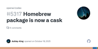 Attempting to update Codex using Homebrew with the previous formula does not work as expected: $ brew upgrade codex Warning: Treating codex as a cask. For the formula, specify the `--formula` flag. To silence this message, use the `--cas... More on github.com