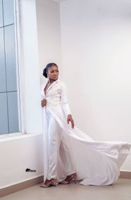 A cap sleeve textured bodice gives way to a cape-like colorful floral train. ... A sassy jumpsuit bridal look with sleek cutout trousers flowing elegantly into a keyhole lace top. ... This unique modern style pairs intricately designed pants featuring delicate lace accents, with a modern one button suited vest style.