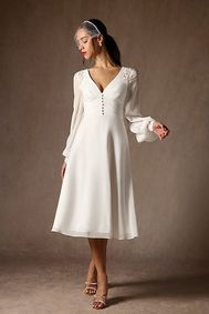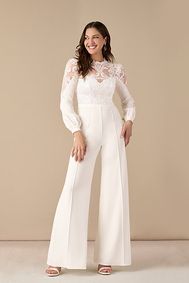 A white lace mini dress featuring a tiered skirt, puff sleeves, and supportive bustier bodice. ... A white, one-shoulder linen gown featuring a waist cutout, side slit, and full sleeve. ... A white jumpsuit featuring a feathered bodice, wide legs, and stretch woven satin fabric.