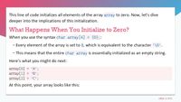 As you can see, no random content: if there are fewer initializers, the remaining of the array is initialized with 0. This the case even if the array is declared inside a function.