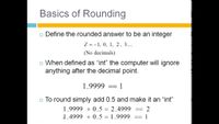 July 9, 2025 - Because C++ allows overloading, you can call overloads of round that take and return float and long double values. In a C program, unless you're using the <tgmath.h> macro to call this function, round always takes and returns a double.