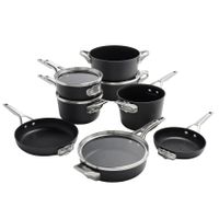Costco has a 13 piece Calphalon commercial hard anodized set for 200.00.