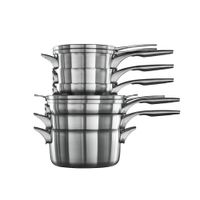 Uniquely designed to stack and nest in any order, this cookware set from Calphalon takes up to 30% less room in drawers and cabinets. Constructed with a heavy-gauge aluminum core, the stainless steel pots and pans heat quickly and evenly.View all Calphalon products. Set includes: 8" and 10" fry pans, 2.5- and 3.5-qt. saucepans with lids, 3-qt. sauté pan with lid and 6-qt. stockpot with lid. Stainless steel and aluminum. Tempered glass lids. Stay-cool stainless steel handles. Compatible with all cooktop types. Dishwasher- and oven-safe to 450 degrees. Imported.