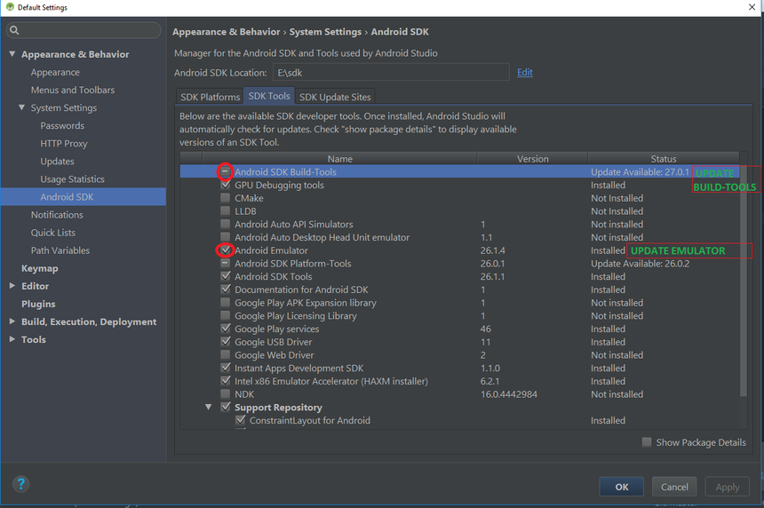 Settings --> Android SDK --> SDK Tools(tab) --> Android SDK Build-Tools