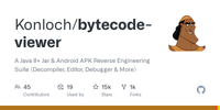 An Advanced Lightweight Java Bytecode Viewer, GUI Java Decompiler, GUI Bytecode Editor, GUI Smali, GUI Baksmali, GUI APK Editor, GUI Dex Editor, GUI APK Decompiler, GUI DEX Decompiler, GUI Procyon Java Decompiler, GUI Krakatau, GUI CFR Java Decompiler, GUI FernFlower Java Decompiler, GUI DEX2Jar, GUI Jar2DEX, GUI Jar-Jar, Hex Viewer, Code Searcher, Debugger and more.