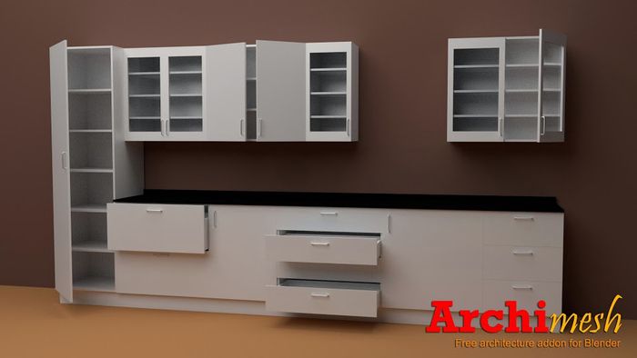 • Archimesh: Archimesh gives you the ability to add great detail to your buildings: add rooms, house structure (walls), doors (one and two leafs), columns, stairs (strait and curved), tile roofs, cabinets, shelves, windows, books, lamps, curtains, etc. It can also UV unwrap rooms! You can download it here and you can get more information on how to use it here. Here is a sample of the cabinets with shelves: