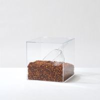 -1/4" thick lucite storage bin with hinged lid.-Matching acrylic food scoop included.-Air-tight closure keeps pet food fresh. -Clear bin allows you to see contents.-Modern bin adds style to your countertop or pantry.-Ships in 2-3 weeks.-Custom size available, email: [email protected]
