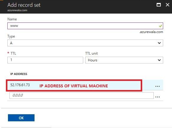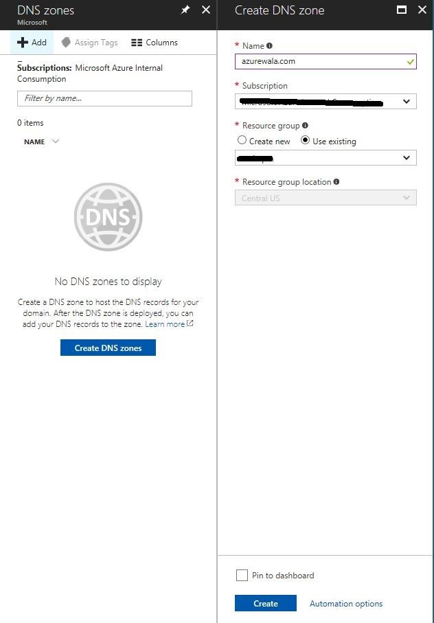 Go to Azure Portal => New => search DNS zones => Create DNS zones