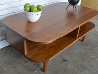 An updated take on a mid-century modern design, this coffee table is sure to make a splash in your living room layout. It has a tabletop crafted from engineered wood, with four flared solid wood legs that give plenty of support. What stands out though is the abstract-shaped top with rounded edges for a more contemporary look.