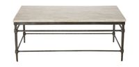 The Vida rectangular coffee table with crystal stone veneer top is supported by a hand-forged iron base in a natural rustic finish. Additional pieces in the Vida stone-top collection include Vida Square Stone-Top Coffee Table, Vida Stone-Top End Table, and Vida Stone-Top Demilune Console.
