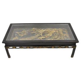 A vintage coffee table with a mahogany frame and glass top. This vintage table features a French ... Vintage Chinese Relief Carved Ho ho Bird Glass Top Display Black Coffee Table.