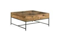 Enhance your living space with the Glass Top + Natural Wood Square Coffee Table With Storage. This rustic coffee table features a unique shadow box design, combining natural wood and metal for an industrial touch. The tempered glass top reveals four separate compartments, perfect for stylish storage and display.