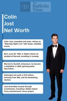 November 13, 2024 - Colin Jost, comedian, actor, and SNL writer, rose from Staten Island roots to become a leading voice in comedy. Known for his "Weekend Update" role and entrepreneurial pursuits, including a Staten Island Ferry project, Jost continues to expand his creative impact. The Bulletin Time · Net Worth ·