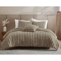 The comforter and shams feature a taupe faux fur with a channel texture, providing a plush and cozy feel. The sets muted taupe tones add a sophisticated and calming touch to any bedroom decor.