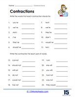 Contractions Circles – We've got some spelling issues here. Identifying Contractions – The example should really solidify the directions for students. What Are Contractions? – It is neat to match what a contraction actually says to remind students of languages purpose. Create the Contractions – In the sentences below, you will turn the words within the ( ) into contractions.