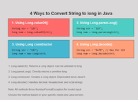 There is also this method: Long.valueOf(str); Difference is that parseLong returns a primitive long while valueOf returns a new Long() object.