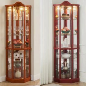 Organize and display your prized possessions in a corner glass cabinet. Discover cabinets with adjustable shelves, glass doors, and built-in lighting.