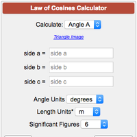 Suggest a new calculator! ... A = angle A B = angle B C = angle C a = side a b = side b c = side c P = perimeter s = semi-perimeter K = area r = radius of inscribed circle R = radius of circumscribed circle · *Length units are for your reference-only since the value of the resulting lengths will always be the same no matter what the units are. Uses the law of cosines ...