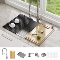 KRAUS 33" Dual Mount Single Bowl Kitchen Sink with 22" Commercial Kitchen Faucet, Kitchen Combo Set Includes: Stainless Steel Sink, Pull-Down Commercial Style Faucet, Soap Dispenser, Roll-Up Dish Drying Rack, Bamboo Cutting Board, Bottom Grid, Drain Assembly, CapPro™ Decorative Drain Cover, Lifetime Limited Warranty: Satisfaction Guaranteed with Customer Service That Puts You First, Spot-Free All-Brite™ Finish: Faucet Finish Resists Fingerprints, Water Spots, and Fading, for a Flawless Look with Minimal Maintenance,