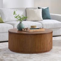 Point Cabrillo Round Storage Lift-Top Coffee Table, Constructed of Rubberwood Solids and Acacia Veneers, Lift-Top Design Transforms Into a Workspace or Dining Surface, Concealed Trunk-Style Storage, Soft Close Hinges, Adjustable Floor Levelers,