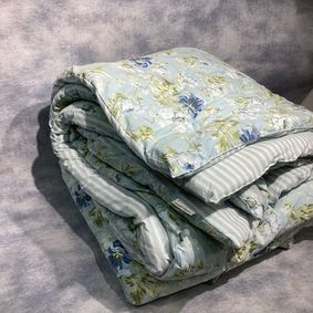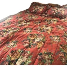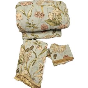 A grey, 100% cotton comforter with ruffled edges, filled with hypoallergenic duck down and feathers. ... A vibrant multi-colored Jacobean floral queen comforter set made from 100% machine washable cotton.