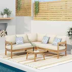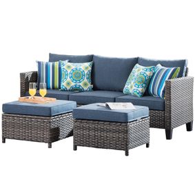 Crafted from durable fir wood with ... or patio. The set includes three chairs, one ottoman, and a matching coffee table—all designed to provide a relaxing outdoor experience. Thick, soft cushions with water-resistant covers offer a comfortable ...