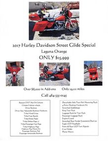 Philadelphia · 2019 Husqvarna 701 Supermoto Motorcycle · $9,000 · Collegeville · 2006 Suzuki V-Strom 650 · $2,500 · Downingtown · 1999 Victory V92C · $4,750 · East Norriton · 2010 Honda Gold Wing Airbag GL1800 · $14,900 · Honda Gold Wing · 2006 sinister chopper just built ·