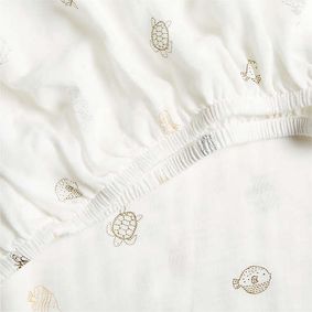 Countless creatures frolic beneath the waves, swimming across our Sea Crib Fitted Sheet. Sweetly illustrated in oceanic shades of aqua, purple and grey on bright white organic cotton, the sea turtles, narwhals and all their fishy friends delight animal-loving little ones. For a coordinated nursery, pair the fitted crib sheet with the other pieces in our exclusive sea-themed collection.Sheet with sea creatures. 100% organic cotton. Machine wash cold, dry low. Do not bleach, iron or dry clean. 8" pocket depth. Made in India.