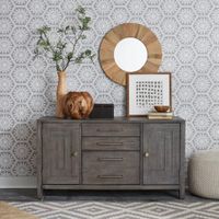 Add chic storage to your dining space with the Blair Credenza from the Universal Furniture Modern Farmhouse collection. This contemporary credenza is packed with features, including an inset stone top, and four doors with sleek metal hardware. Inside you'll discover two drawers, including a felt-lined bottom drawer with silverware tray insert, two adjustable shelves, and wire cutouts at the back. The weathered gray finish will give your dining space a fresh welcoming look.