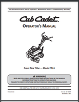 Cub Cadet FT 24 Front Tiller Operators Manual. I have a large database and have only listed a fraction of thus far. Things happen. I will be happy to work with you. New reproduction of Owner Manual, Printed in black and white.