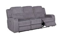 Covered in a soft inviting luxury suede fabric this power reclining sofa from Global Furniture USA sets the scene for the perfect place to grab that relaxing time you deserve. Finished in an attractive dark grey with contrasting light grey tones it is sure to complement many decors. Spacious seating and button power recline allows you to lay back with ease while the plush back and seat pull all the design elements together making this a must have piece for your living space that will not disappoint.