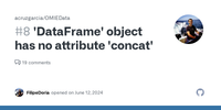June 12, 2024 - 'DataFrame' object has no attribute 'concat'#8 · Copy link · FilipeDoria · opened · on Jun 12, 2024 · Issue body actions · Hey! I just tried using the package, unsuccessfully. Maybe something changed within OMIE endpoints? I tried the example code you suggested: `import datetime as dt import matplotlib.pyplot as plt ·