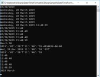 // create date time 2008-03-09 16:05:07.123 DateTime dt = new DateTime(2008, 3, 9, 16, 5, 7, 123); String.Format("{0:y yy yyy yyyy}", dt); // "8 08 008 2008" year String.Format("{0:M MM MMM MMMM}", dt); // "3 03 Mar March" month String.Format("{0:d dd ddd dddd}", dt); // "9 09 Sun Sunday" day String.Format("{0:h hh H HH}", dt); // "4 04 16 16" hour 12/24 String.Format("{0:m mm}", dt); // "5 05" minute String.Format("{0:s ss}", dt); // "7 07" second String.Format("{0:f ff fff ffff}", dt); // "1 12 123 1230" sec.fraction String.Format("{0:F FF FFF FFFF}", dt); // "1 12 123 123" without zeroes String.Format("{0:t tt}", dt); // "P PM" A.M. or P.M. String.Format("{0:z zz zzz}", dt); // "-6 -06 -06:00" time zone