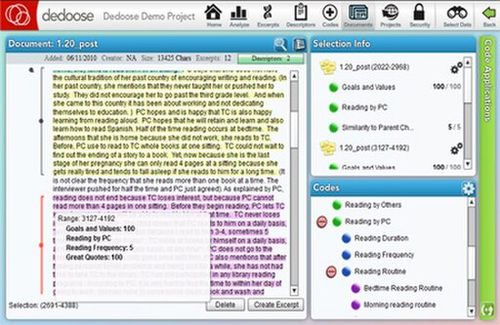 Dedoose is a web-based application designed for individual work or synchronous collaborative research from different sites; it provides a range of mixed methods tools for the handling of text, spreadsheet data and video. A series of workspaces allows coding, retrievals and memoing and a wide ...
