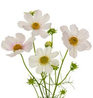 Color: White, yellow, red, pink and shades, surrounding a yellow center · Botanical facts: The name is from the Latin word kosmos meaning beautiful. Cosmos is native to Mexico and related to chrysanthemums and dahlias.