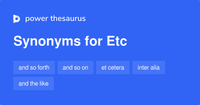 Synonyms for etc include catacosmesis, anticlimax, arrangement, climax, chronological order, atabeg, amir, emir, governor and mirza. Find more similar words at wordhippo.com!