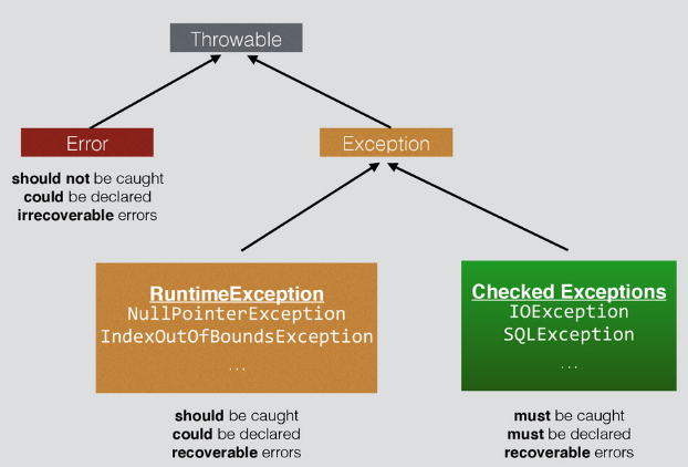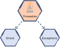 RuntimeException) - Very often a programming error such as aNullPointerExceptionor an illegal argument. Applications can sometimes handle or recover from thisThrowablecategory -- or at least catch it at the Thread'srun()method, log the complaint, and continue running. - Checked Exception (aka Everything else) - Applications are expected to be able to catch and meaningfully do something with the rest, such as