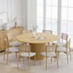 The Transformer Round Table Collection is a thoughtfully designed modular dining set that includes an extendable round-to-oval dining table, curved sideboard, expandable bench, and rounded chairs. Blending refined craftsmanship with adaptability, this modern round dining table set offers a space-saving solution without compromising on style or storage. It's ideal for those who want a round wood dining table that adapts to every occasion.