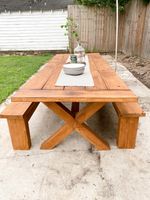 August 6, 2024 - This farmhouse style outdoor table and bench are big! At 9 1/2 feet, you can fit about 8-10 people around this table, and it is STURDY! This is a table that is built to withstand the elements, and last for years to come. The build is pretty straight forward, using basic tools like a miter saw and Kreg pocket hole jig. Bonus bench plans are below in the extras tab!
