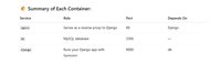 version: '3'services:web:depends_on:- dbnetworks:- my-networkbuild: .command: ["python", "manage.py", "runserver", "0.0.0.0:8000"]volumes:- .:/appports:- "8000:8000"