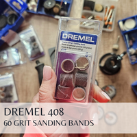 Turn your Dremel rotary tool into a versatile sanding machine with the 408 1/2 In. (12.7 mm) 60 Grit Sanding Bands. Sanding bands can be used to remove finishes, remove rust from metal surfaces, or rough shape and smooth on wood, rubber, fiberglass, metal, and other soft materials. The 408 features a coarse 60 grit abrasive which efficiently clears away a layer of debris or finish from material. The replaceable bands can be used with the 407 1/2 In. Sanding Drum Mandrel or pair it with the EZ407SA Dremel EZ Drum™ to quickly & easily change out bands. · TIPS: Sanding bands are easily replaceabl