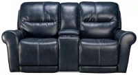 Sink into luxurious comfort with the Futura Delta Leather Power Loveseat Console Recliner. Upholstered in deep Delta blue leather and featuring lavishly cushioned seats and tufted backs, along with rolled armrests, it offers exceptional coziness. This contemporary-style home furniture comes with convenient power reclining, making it an ideal choice for relaxing after a long day. The center console includes a storage compartment and two cup holders. The convenient USB port lets you charge your device while you relax. Custom-order leathers are available.