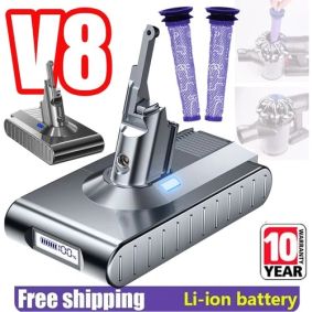 Replacement Battery for Dyson V8 | SV10 V8 Absolute / V8 Animal Extra Bring your Dyson V8 back to full power with this premium, high-performance replacement battery. Designed for seamless compatibility and long-lasting durability, it delivers strong suction, reliable runtime, and safe charging—just like the original Dyson battery. 🔋 Key Features ✓ Intelligent Protection SystemBuilt-in smart circuitry prevents over-charge, over-discharge, overheating, and short-circuit issues—ensuring safe, stable performance. ✓ Premium Lithium-Ion PowerCrafted with high-quality Sony battery cells for improved