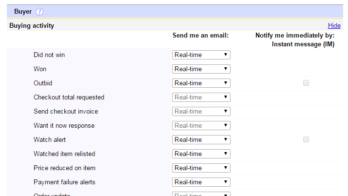 If you haven't amended any account settings that you will real-time alerts for items being watched. To check your preferences you need to: