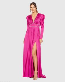Tadashi Shoji has beautiful gowns. https://www.tadashishoji.com/ember-cape-sleeve-gown-green More on reddit.com