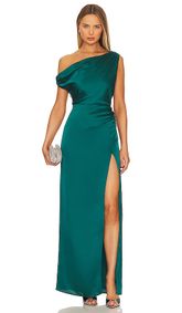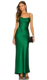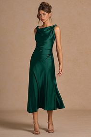 A sleek green formal dress with a cowl neckline, front cutout, and high side slit. Dreamy Energy Sleeveless Bodycon Midi Dress in Green ... A sleeveless green bodycon midi dress crafted from stretchy knit fabric with a square neckline. Windsor Luxe Sheen Strapless Ruched Satin Midi Dress in Emerald
