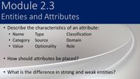 Attribute: Properties that describes an entity such as StudentID, CourseName, or EmployeeEmail. Relationship: A connection between entities such as "a Student enrolls in a Course".